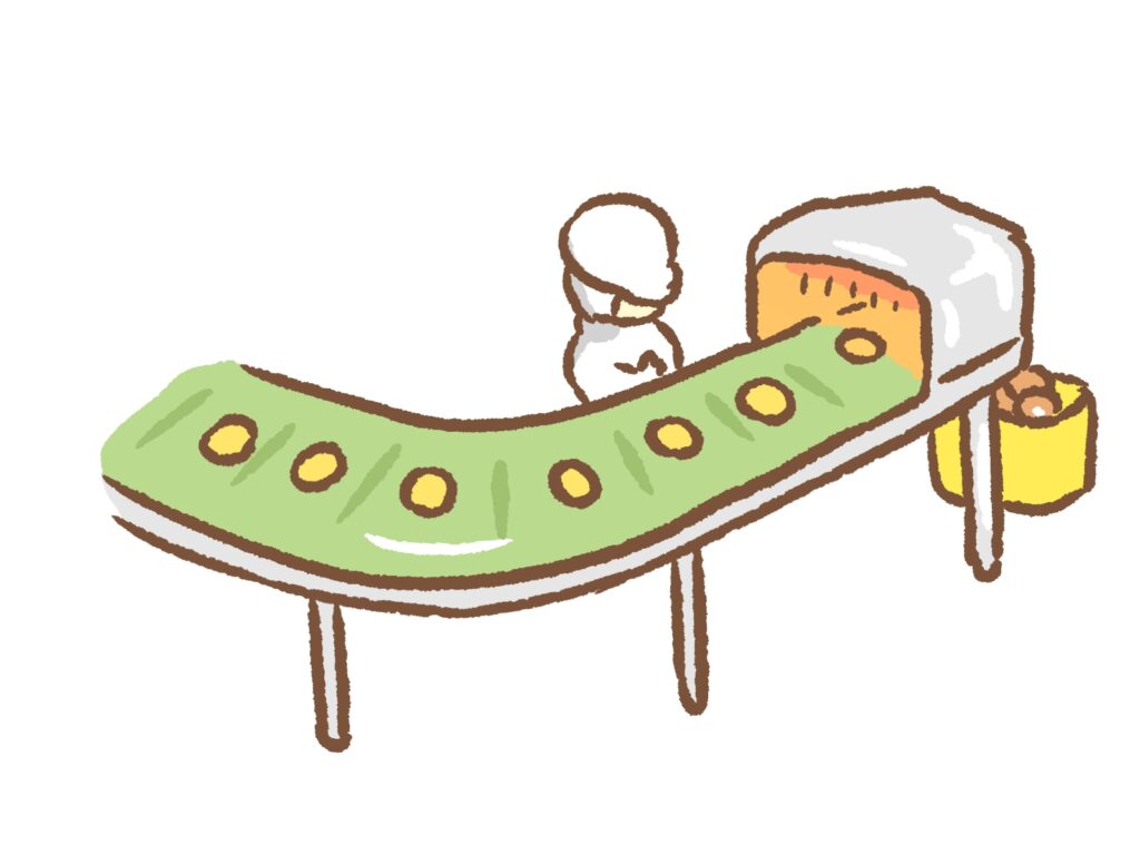 新しい作業一つ目は、ゆで卵製造です!食品工場では、毎日大量のゆで卵が作られています。イメージは、↓な感じのコンベア機械に、生卵をどんどん流し込んでいきます!