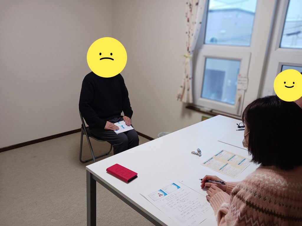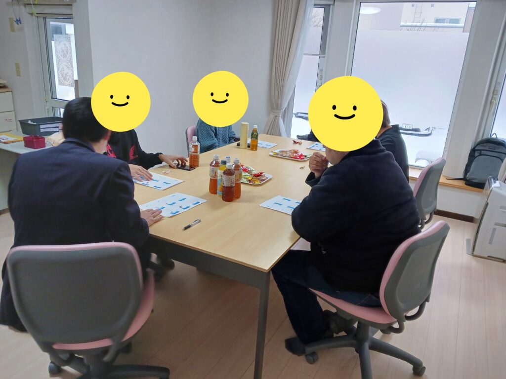 さて、去年の話になりますが、新さっぽろ事業所にて実施した「就労プログラム」のご報告です。新さっぽろでは、年に4回一般就労に関するプログラムを実施しています。12月に行ったプログラムは今年度(2025年度)第3回目の実施で内容は「企業の採用面接の練習」でした。参加希望があった4名の方々が参加してくれました。